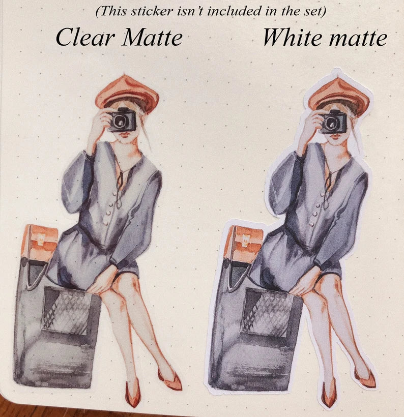 The sticker sheet is available in standard white (stickers are printed on white sticker paper) or matte clear (stickers are printed on clear sticker paper). If you want to get an idea of the difference between these two types of paper, you can see it in the last photo!